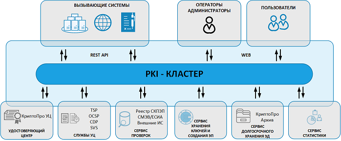 КриптоПро PKI-Кластер интегрируется с основными компонентами PKI-инфраструктуры, такими как удостоверяющие центры (КриптоПро УЦ), сервисы централизованного хранения ключей и создания электронной подписи (КриптоПро Ключ), сервисы проверки электронной подписи (КриптоПро SVS), а также сервисы долгосрочного хранения электронных подписей (КриптоПро Архив) и взаимодействия с системами межведомственного электронного взаимодействия (СМЭВ).