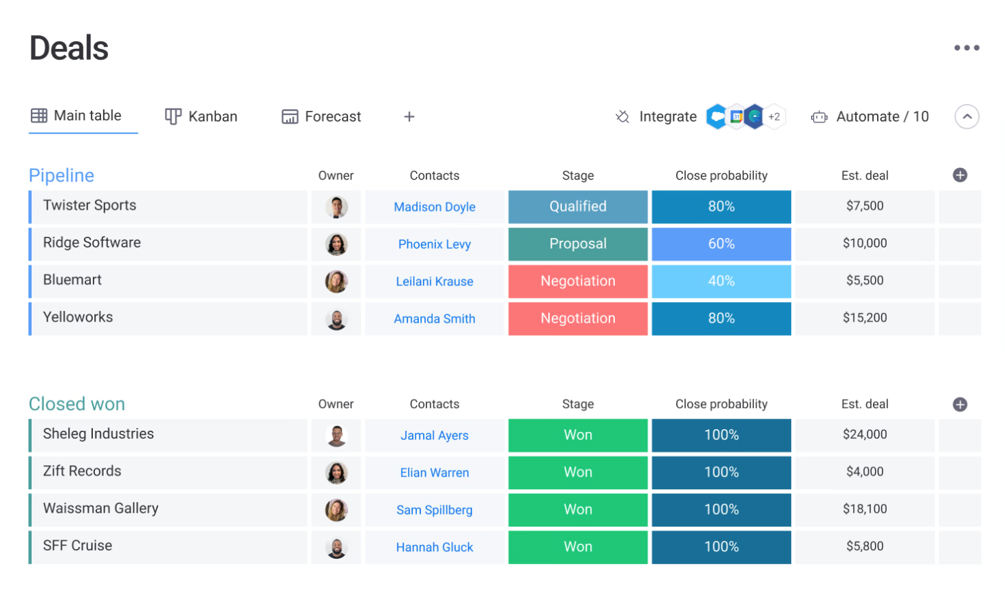 Monday CRM предоставляет мгновенное понимание ситуации по каждой сделке, позволяя в один клик получать доступ ко всей необходимой информации для её закрытия, включая контактные данные, прогресс и следующие шаги.
