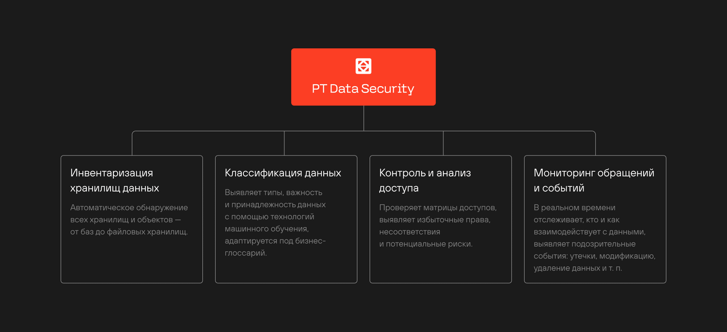 PT Data Security – платформа нового поколения для защиты данных независимо от формата (структурированные, полуструктурированные, неструктурированные) и места хранения (БД, файловые/объектные хранилища). Обеспечивает инвентаризацию, AI-классификацию, мониторинг и контроль доступа в едином окне.